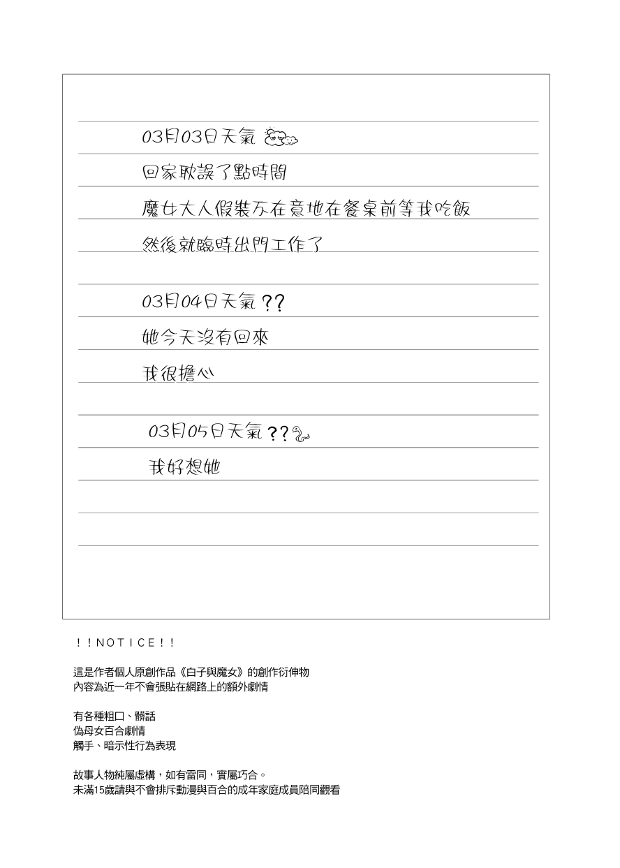 個人自主網路連載作品《白子與魔女》番外, 高中生白子與魔女生活的部分回憶。就算從來沒看過《白子與魔女》的任何一篇故事,也不會有銜接不上的問題。建議先看此本內容再看網路公布的彩色條漫,效果更好:)