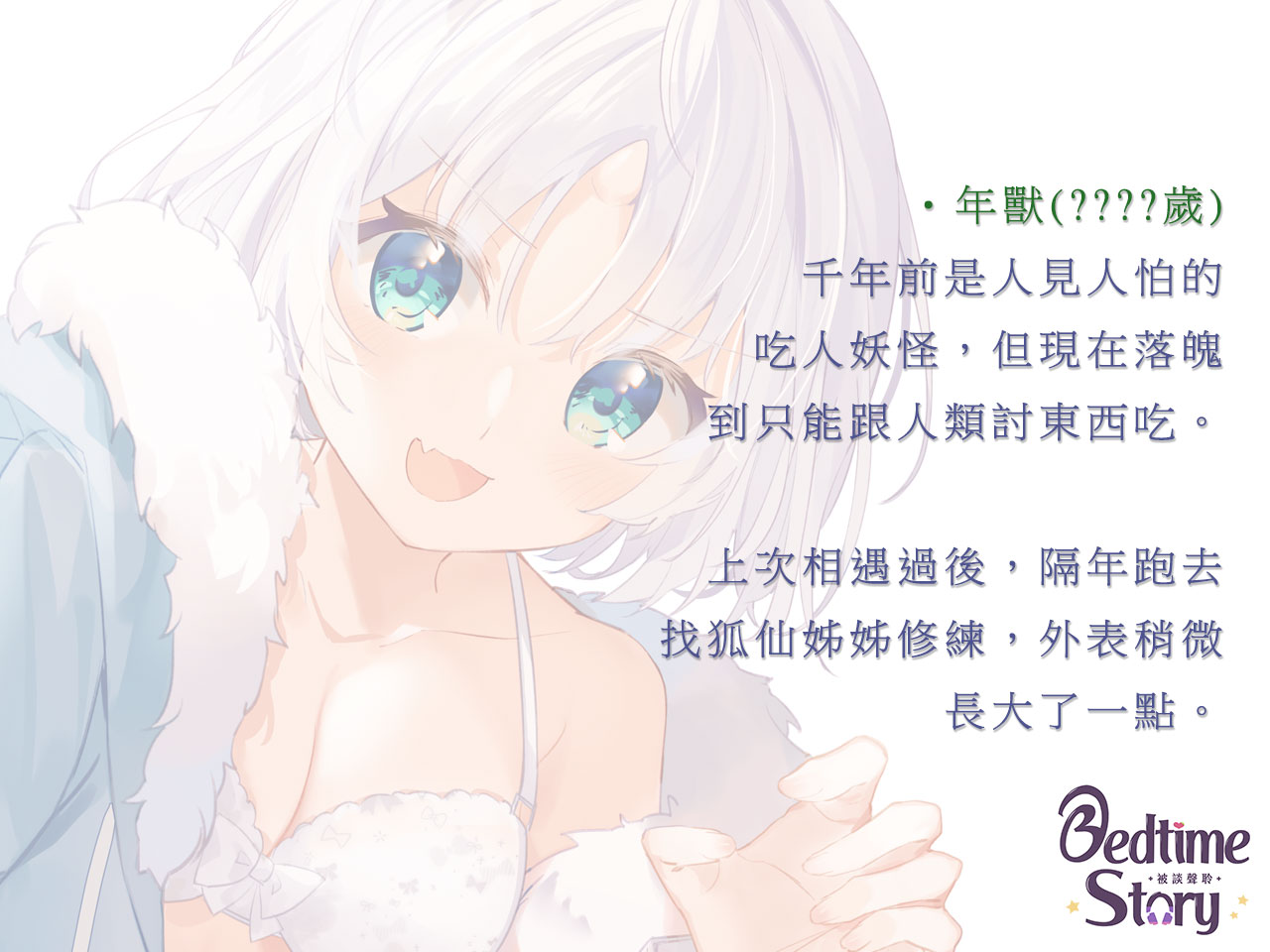 千年前是人見人怕的吃人妖怪,但現在落魄到只能跟人類討東西吃。上次相遇過後,隔年跑去找狐仙姊姊修練,外表稍微長大了一點。