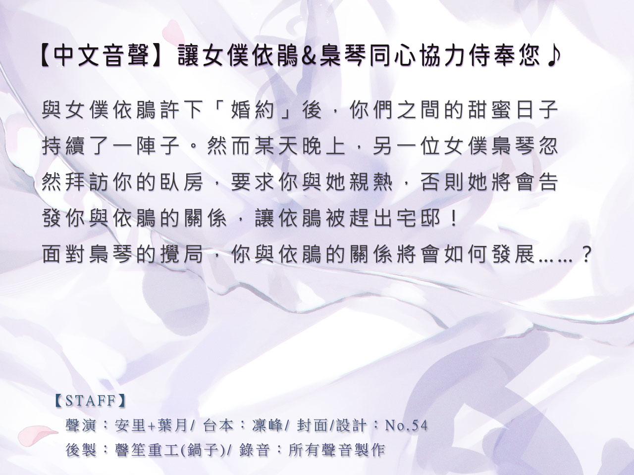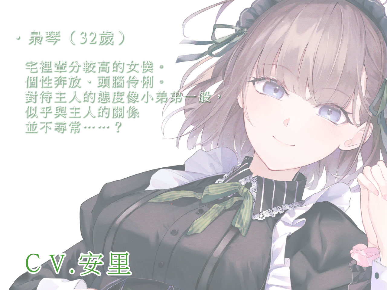 與女僕依鵑許下「婚約」後,你們之間的甜蜜日子持續了一陣子。然而某天晚上,另一位女僕梟琴忽然拜訪你的臥房,要求你與她親熱,否則她將會告發你與依鵑的關係,讓依鵑被趕出宅邸!