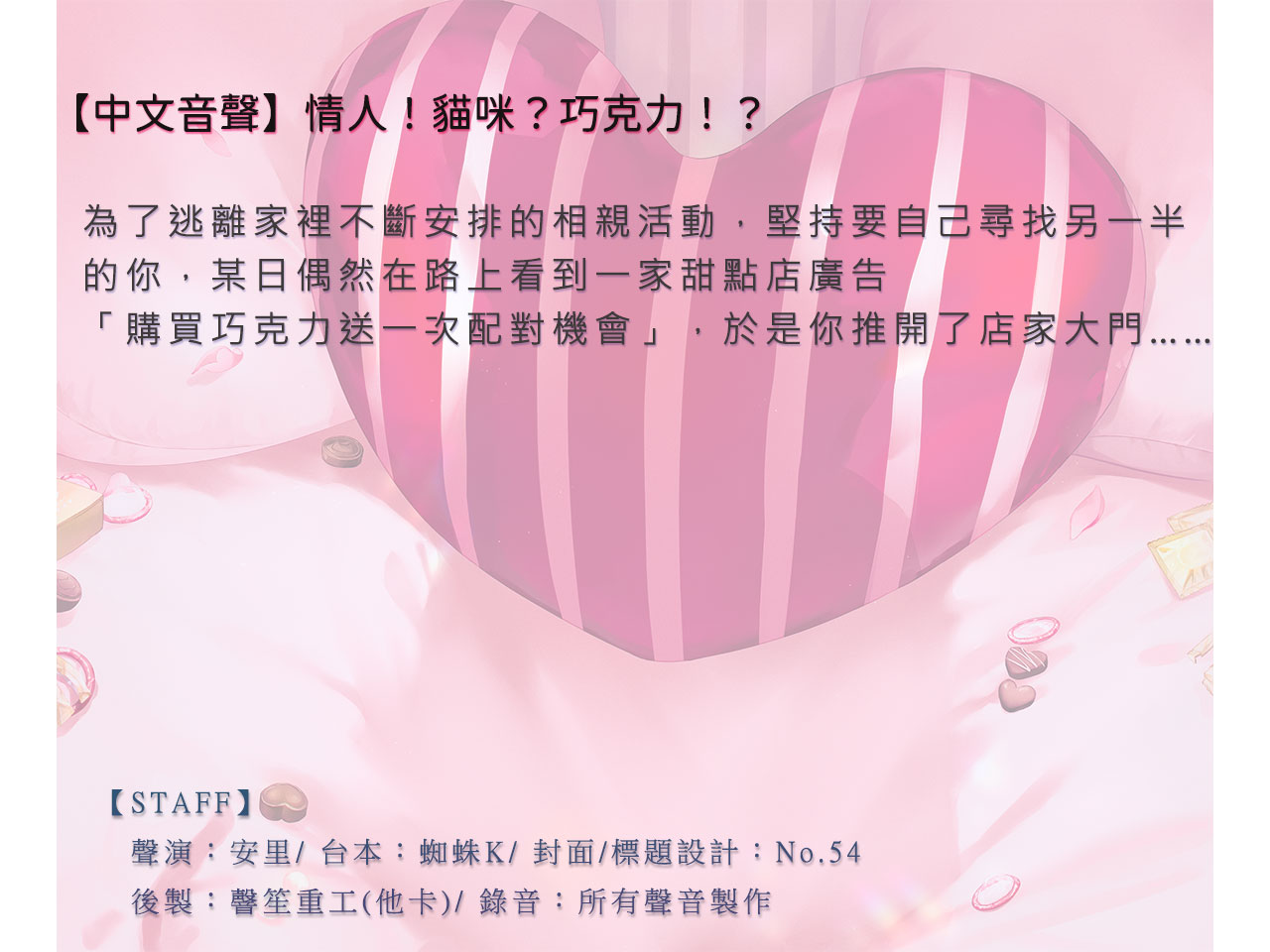 為了逃離家裡不斷安排的相親活動,堅持要自己尋找另一半的你,某日偶然在路上看到一家甜點店廣告「購買巧克力送一次配對機會」,於是你推開了店家大門……